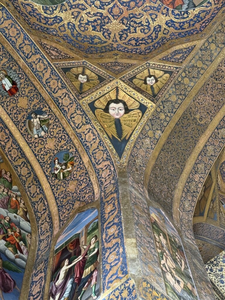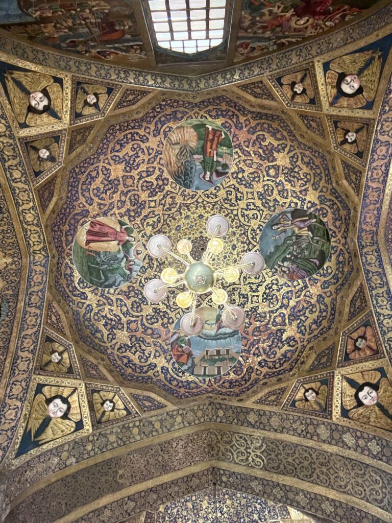 Intricately painted dome ceiling of Vank Cathedral in Isfahan, decorated with biblical scenes, golden floral patterns, and angelic faces around a central chandelier.